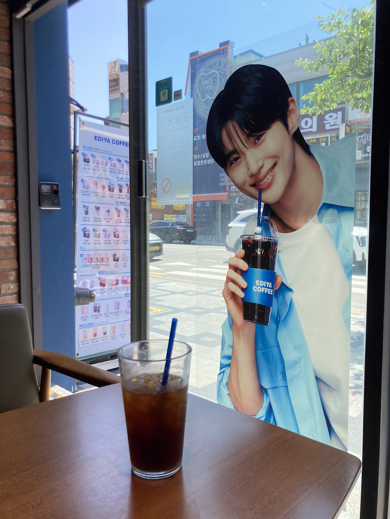 어제에 비해 더운 날씨다. 바람이 통하도록 활짝 열어둔 입구 가까이에 앉았다. 이디야 모델 변우석 배우 사진이 크게 붙어있는 곳 바로 앞이라, 수시로 눈이 마주쳤다. 해사한 그의 미소가 조금 부담스럽다. 시선을 피해 바깥을 내다보았다.