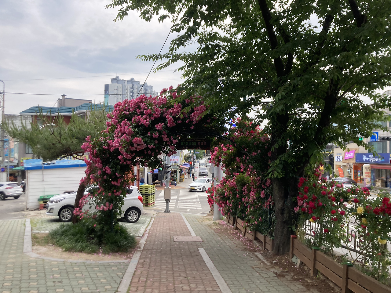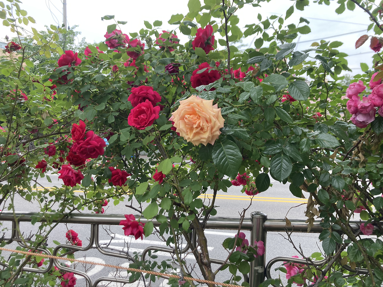 시외 터미널에서 중앙시장 가는 길, 시에서 가꾸는 장미 울타리에 꽃이 풍성하게 피었다. 담당하시는 분이 정성껏 기르는 모습을 지나다니며 봤는데, 이렇게나 탐스러운 장미를 보게 되어 기쁘다.