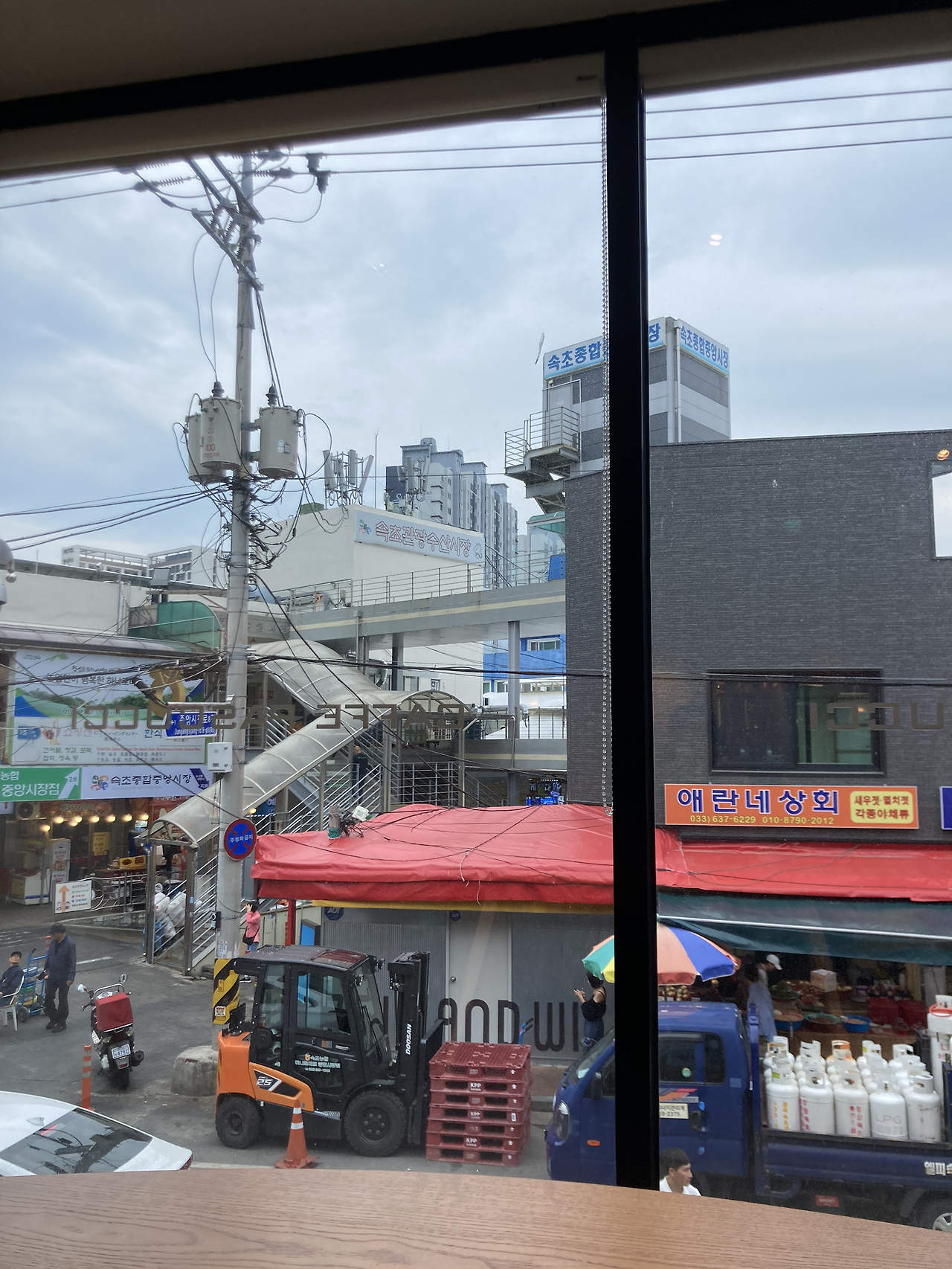 바깥에서 보면 선팅된 유리 너머 실내가 안 보이는데, 안에 앉아서 보면 시장이 훤히 보인다. 널찍한 테이블이 좋아서 창가 자리에 앉았다.
