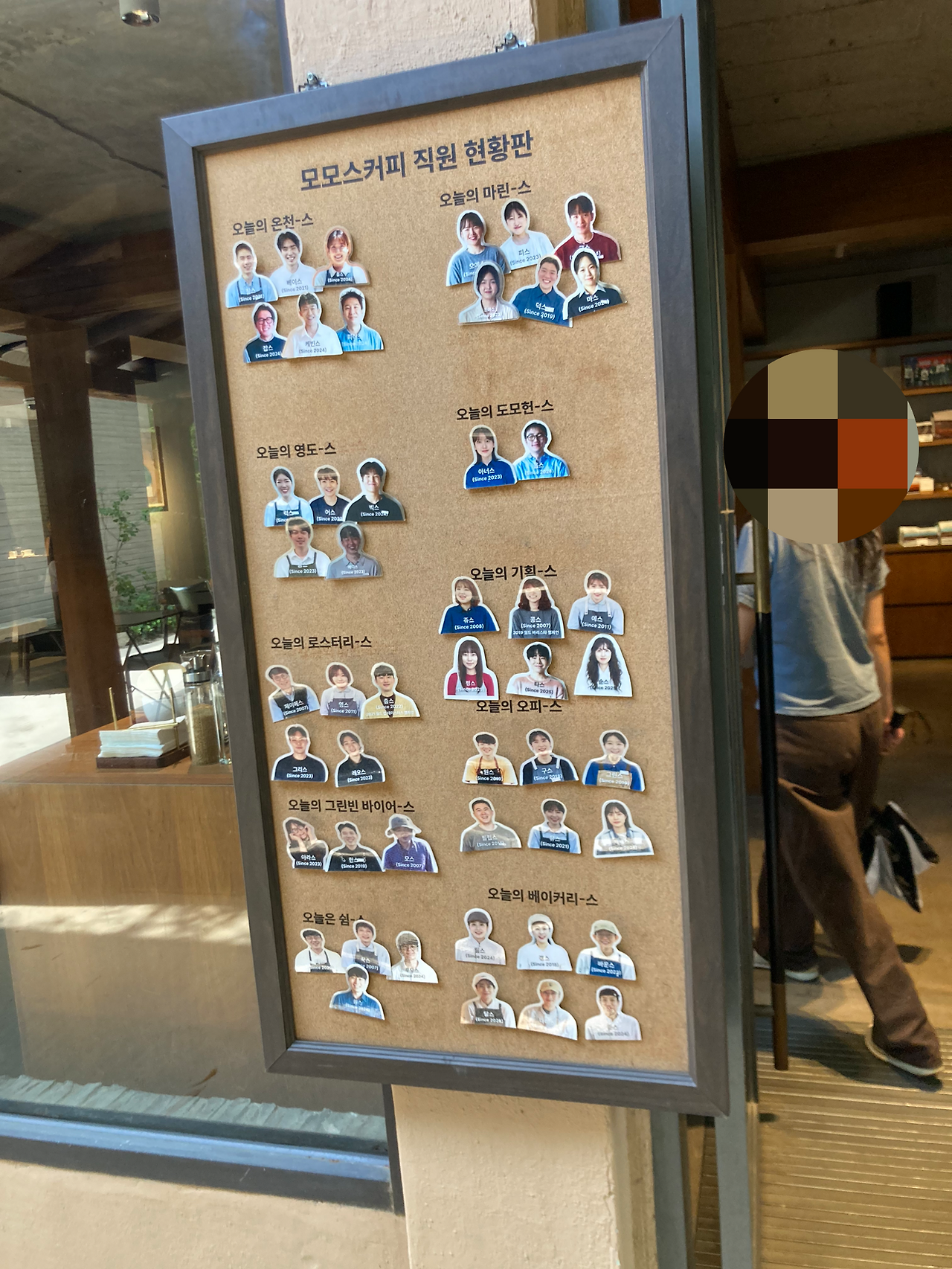 부모님이 운영하시던 식당 한편에서 시작되었다는 모모스 커피. 예전엔 식당이었을 건물 왼편에 정문이 있고, 그 오른쪽에 난 창문으로 도로보다 반계단 낮은 매장 안 풍경이 보인다. 바리스타들이 커피를 내리고 있다.
