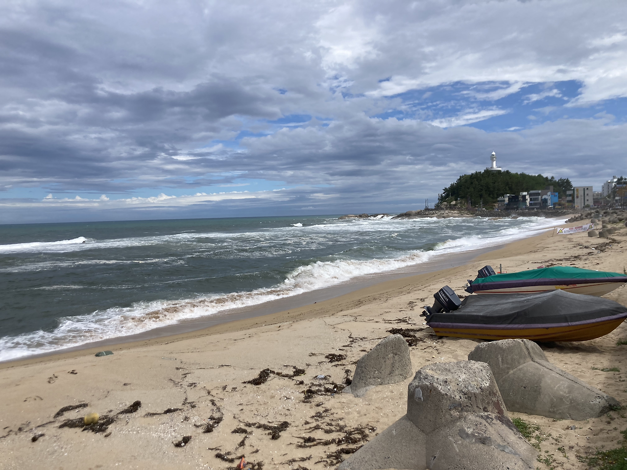 비바람이 치면 파도도 거칠다. 평소보다 육지 쪽으로 더 가까이 다가오는 파도 모양을 따라, 미역도 많이 떠밀려왔다. 오늘 해수욕장은 하루 휴장이다.