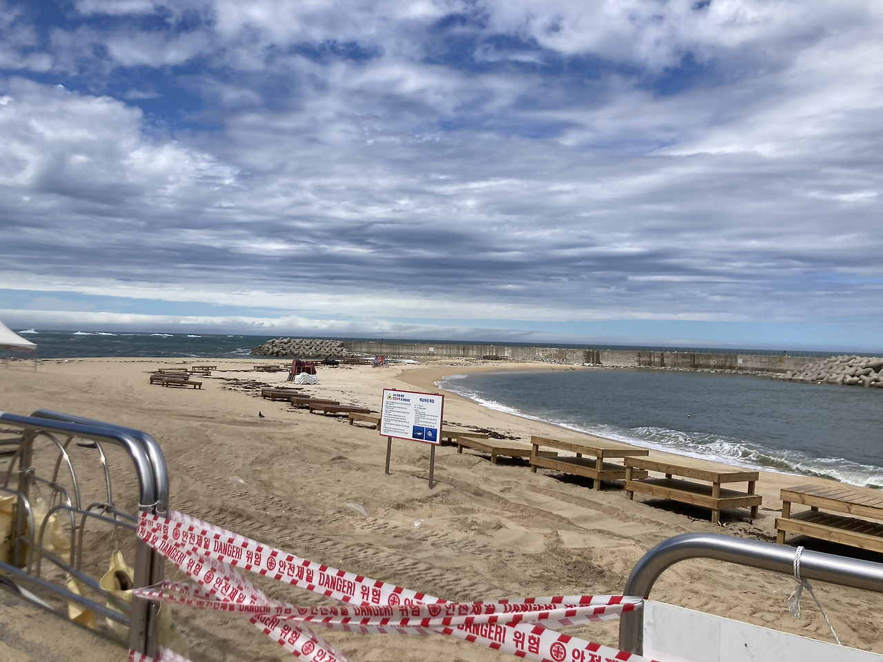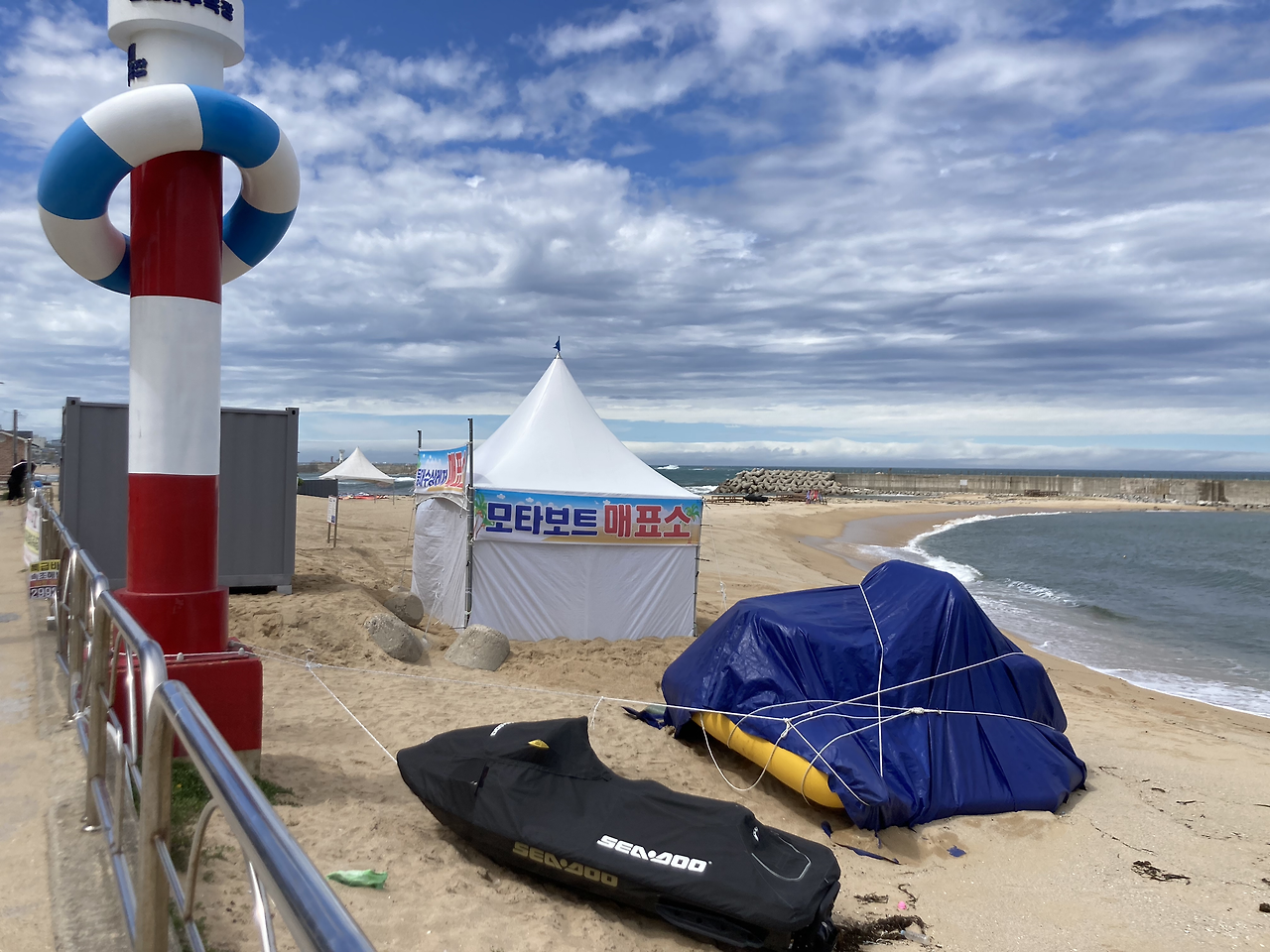 간밤에 분 비바람으로 조업을 나가지 못해서인지, 오징어난전 오른쪽 양미리난전은 닫혀있었다. 등대 해수욕장은 입구를 막아두고, 포크레인 한대가 뒤집힌 모래사장을 다시 정리하는 중이었다.
