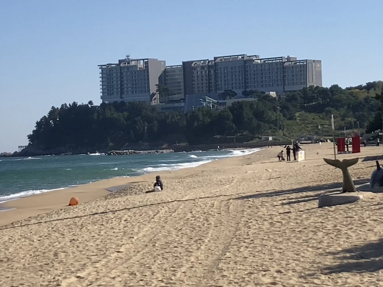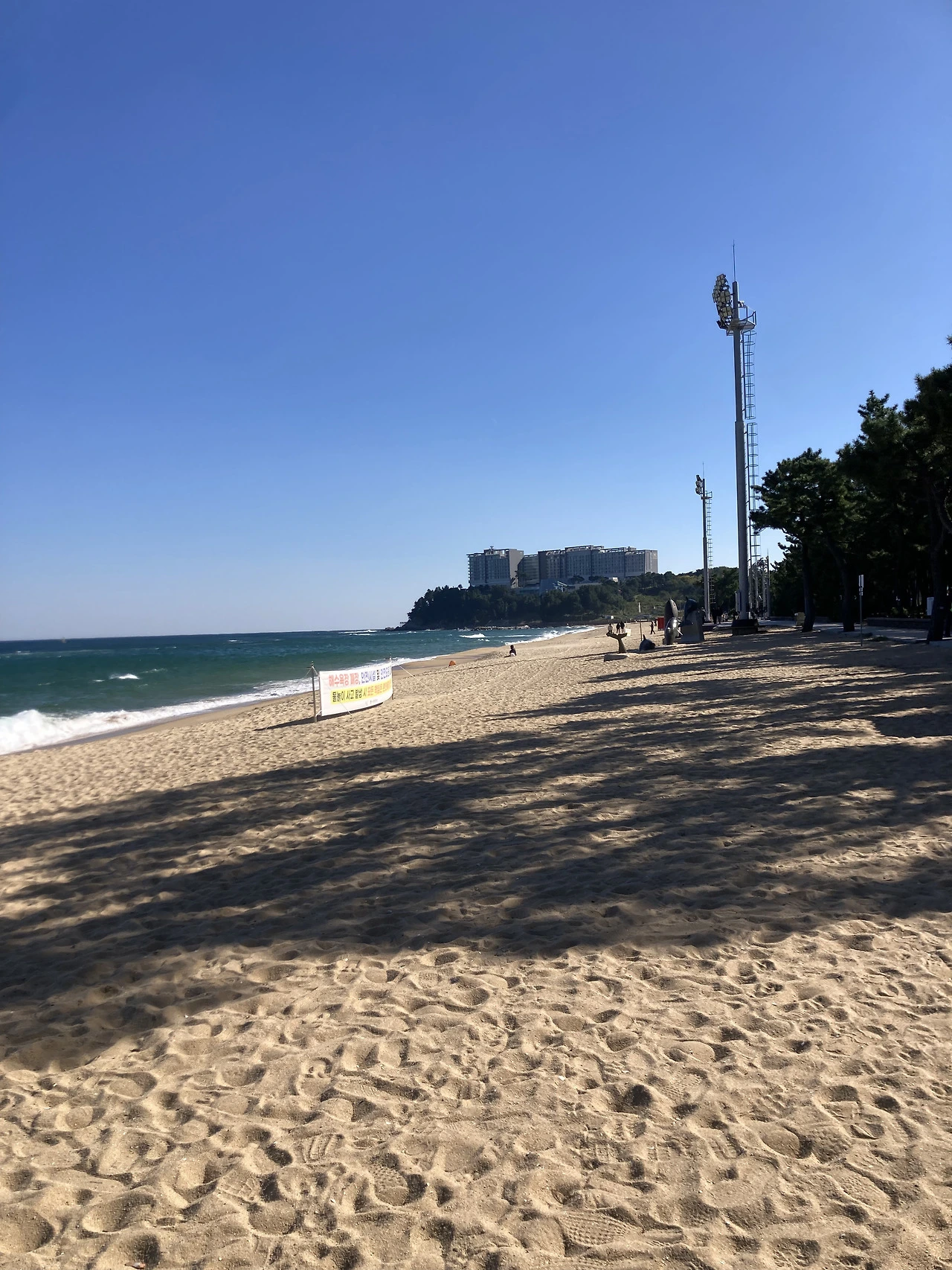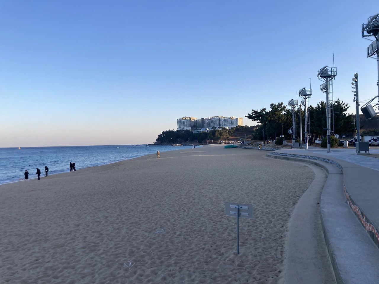 대관람차 ‘속초아이’가 있는 속초해변에서 바다를 왼편에 두고 남쪽을 바라본다. 정면 해안절벽 위에 롯데리조트가 있다.