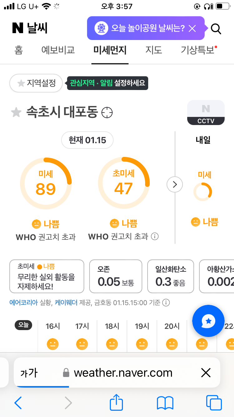 찾아보니 오랜만에 미세먼지 나쁨 수준. 마스크를 안 쓰는 일에 다시 익숙해져서 깜빡했다. 코딱지가 좀 더 생긴 것 같다.