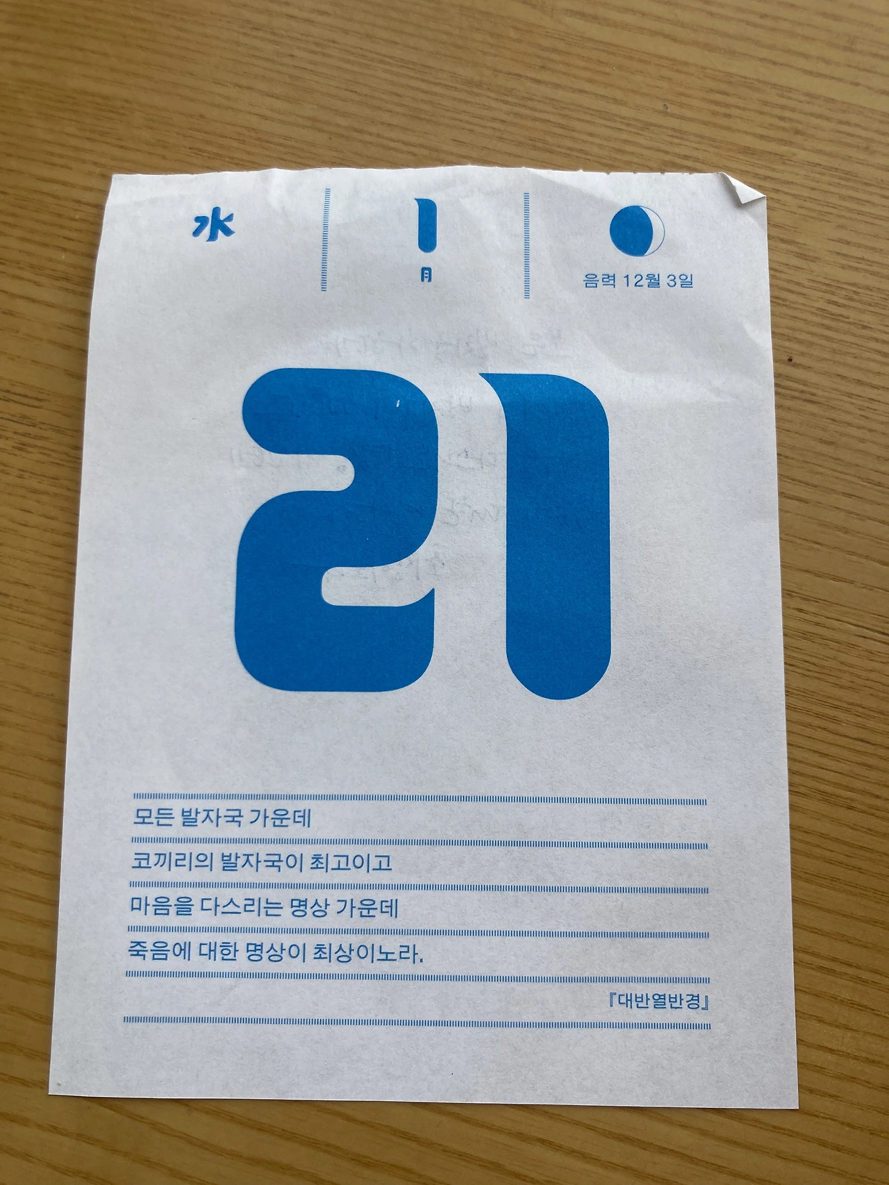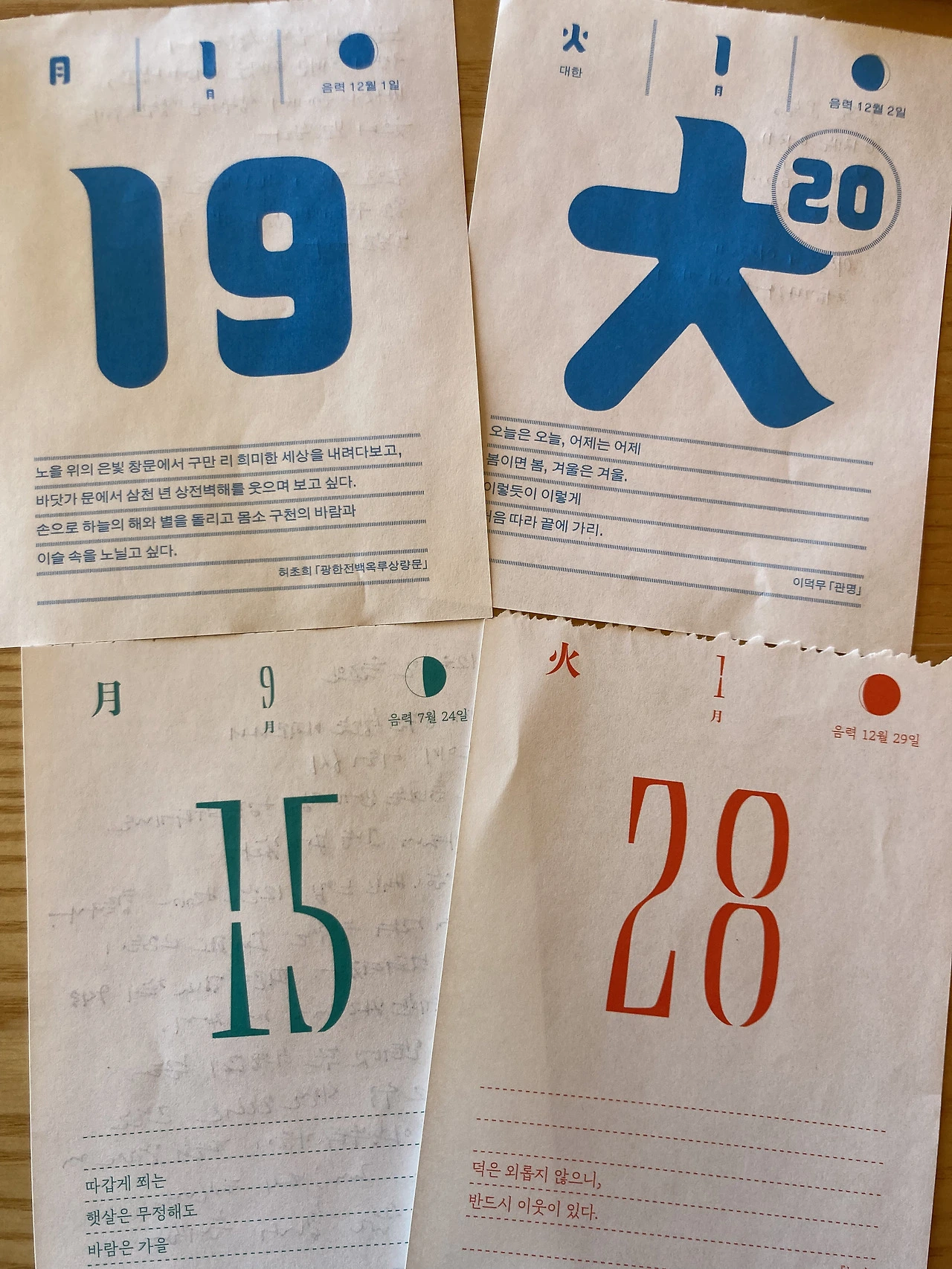 민음사 일력을 처음 알게 됐을 때와 느낌이 달라진 것 같아서 작년 것과 비교해 보니, 올해 글자가 더 굵어지고 디자인이 조금 달라졌다.