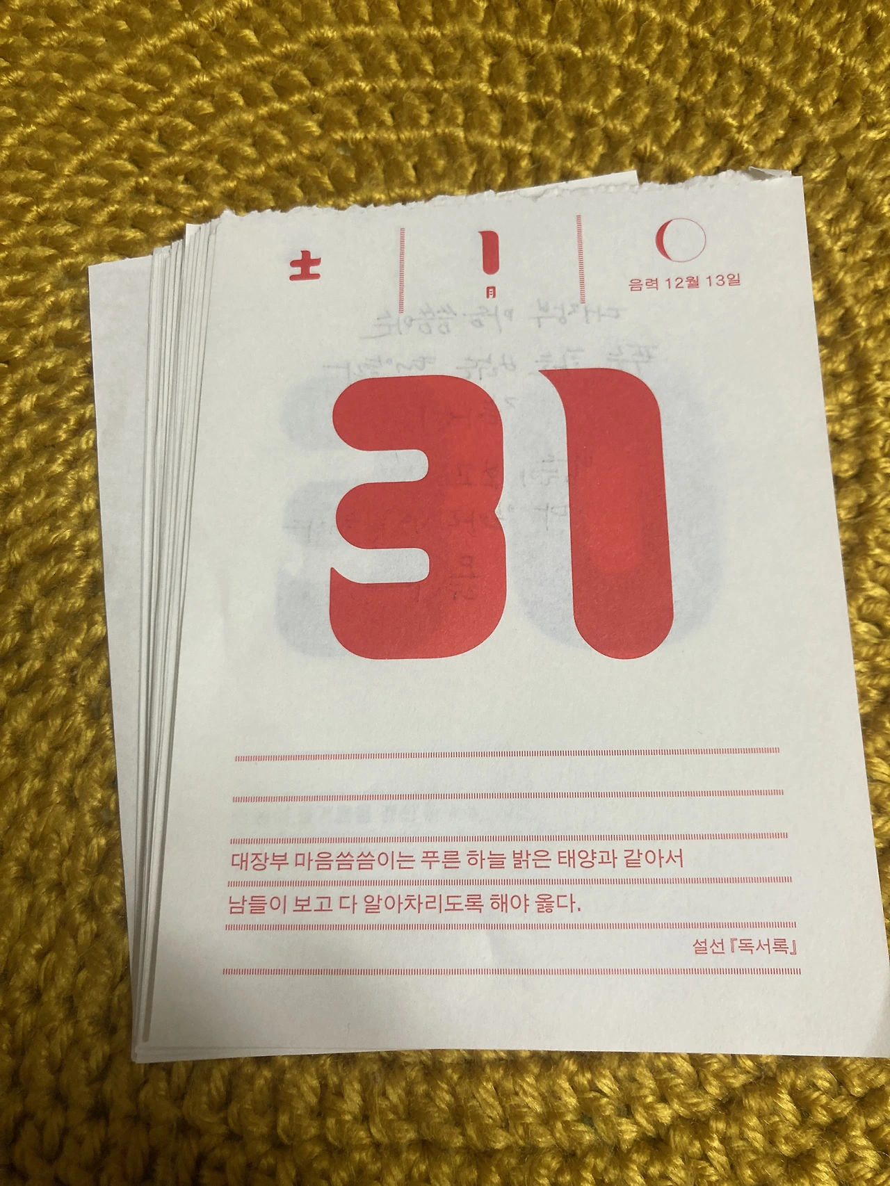 1월의 일력을 모두 뜯었다. 모아놓고 보니 제법 두께가 느껴진다. 지난 한 달이 손으로 만져지는 것 같다.