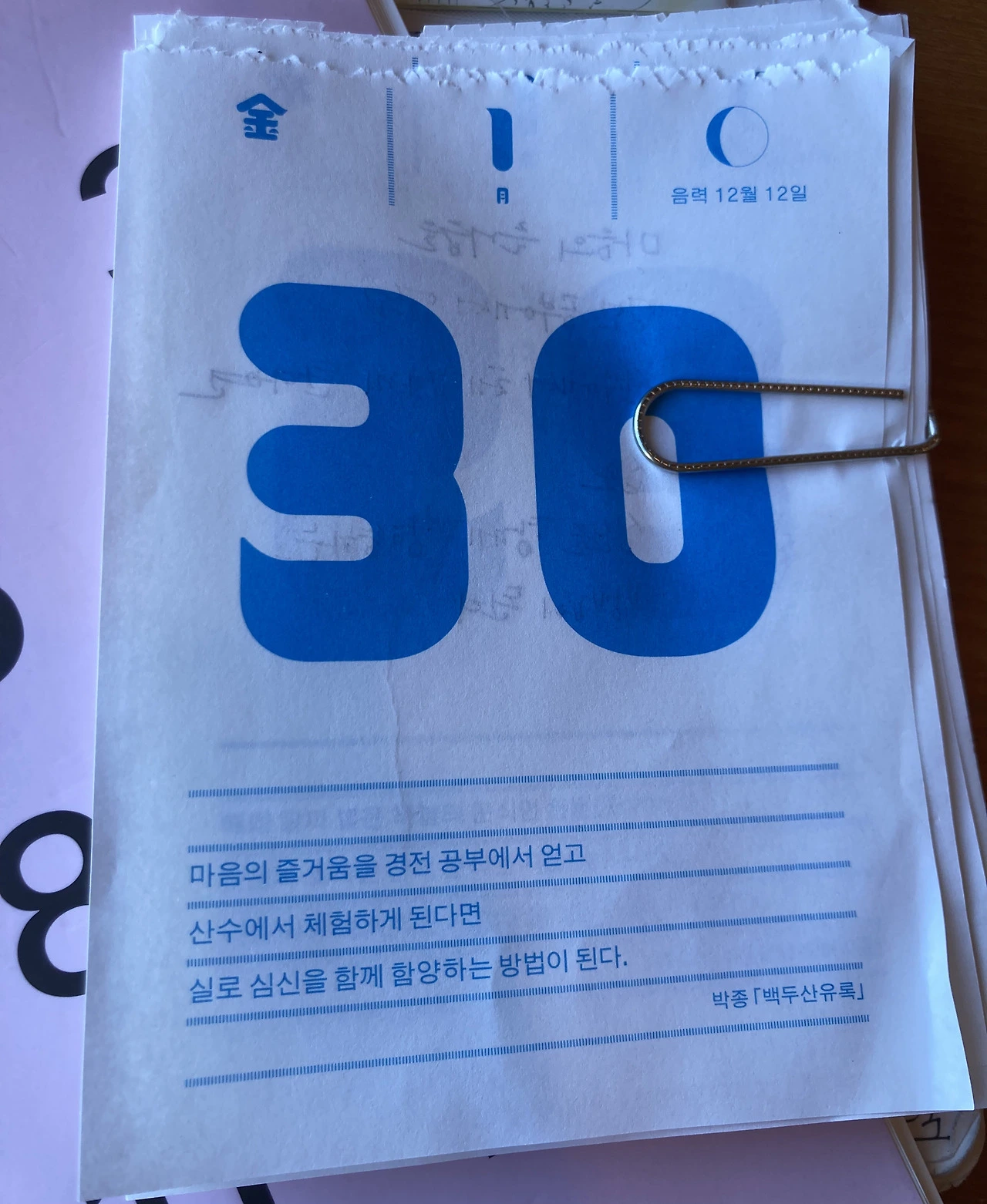 매일 뜯어낸 일력 뒷장에 그날의 문장을 옮겨 적었다. 한 장씩 모아놓고 보니, 잠깐 짬 내어 했던 일도 쌓이면 그럴듯한 무언가가 된다는 걸 새삼 떠올린다.