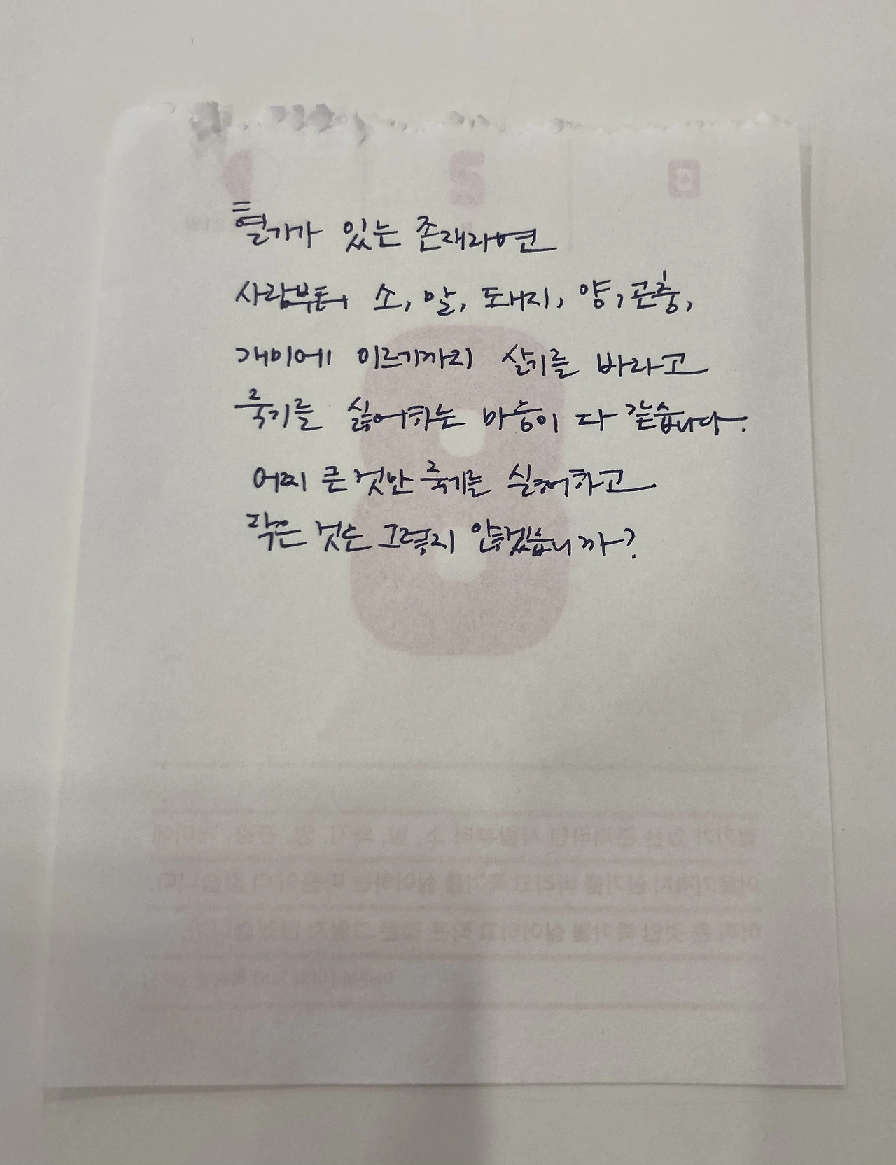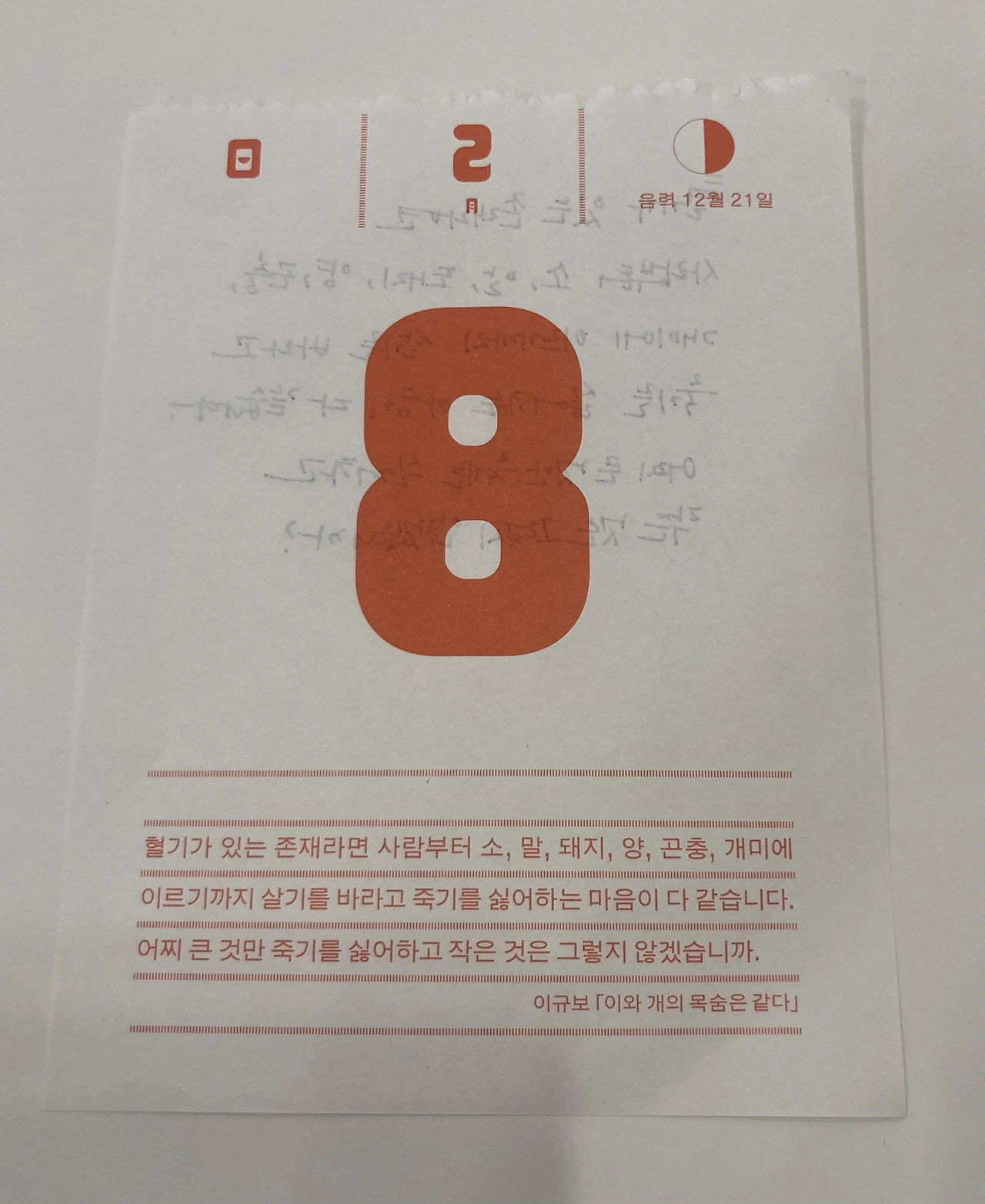 그에 대한 대답이 위 문장이다. 작든 크든, 인간에게 쓸모가 있든 없든 생명이라면 모두가 똑같이 귀하다는 것이다. 일력에 다 실리지 않은 뒷부분에 중요한 부분이 나온다.