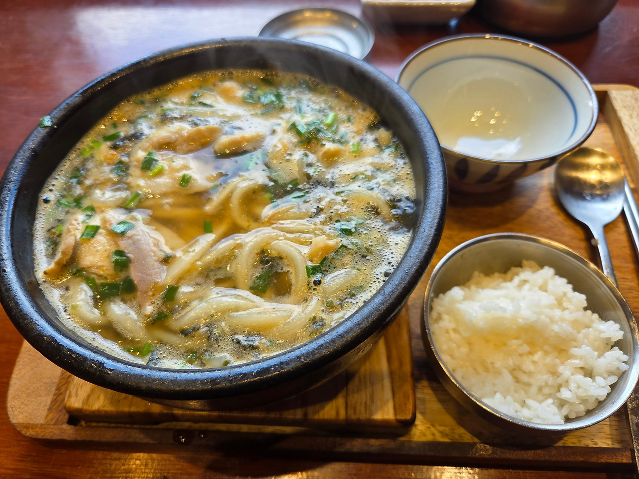 1인용 자리에 앉아 메뉴판 훑고 우동돼지국밥 주문했다.