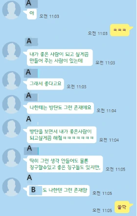 이렇게 너무 A은 말하고 싶어 지게 만드는 사람 같아. A에게 말하는 게 너무 재밌고 A의 얘기를 듣는 게 너무 즐거워서 자연스러운 현상 같아. 내가 우리가 서로 즐겁게 얘기했던 얘기가 너무 와닿고 재밌는 생각들이 많아서 똑같이 다른 사람들에게 했던 적이 있었다? 근데 다른 사람들은 반응이 우리만큼은 아니더라고. 그래서 또 그때 느끼기를 우리가 잘 맞는 관계구나라고 생각 들더라. 이런 생각이나 얘기를 있는 그대로 수용할 수 있는 사람이 얼마나 될까? 그래서 그런지 더 편하고 즐겁게 할 수 있는 것 같다는 생각이 들었어. 그러니까 이렇게 수다맨이 되는 거겠지? 우리 목관리도 잘하자. 많이 얘기 주고받으려면 말이지. 분명 서로를 웃게 한다는 건 사람이 사람에게 줄 수 있는 가장 좋은 선물 중 하나일 거야.