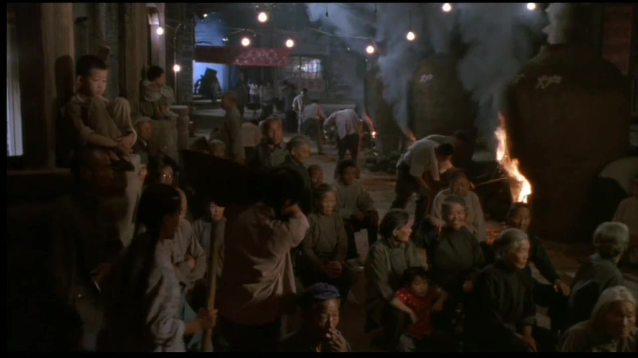 마을 사람들이 푸구이의 그림자극 공연을 보러 앉아있는 옆에서 제철공들이 토법고로 작업을 하고 있다.