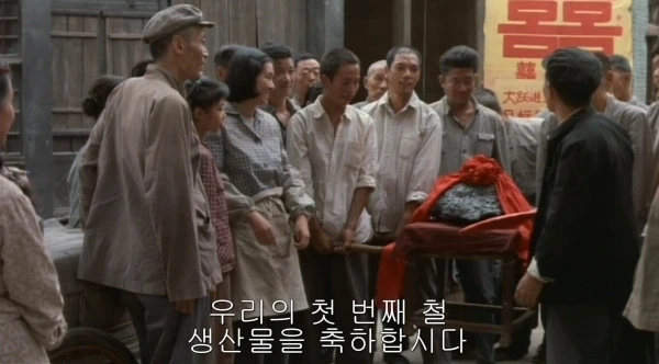 위, 영상 캡쳐 사진을 보자. 현실이라면 이런 그림은 그려지기 어렵다. 소음과 먼지와 열기로 가득 찬 철공장에서 그림자 연극이 가당키나 할까? 영화에서 공연을 보는 남녀노소는 쇠 만들어지는데 별 관심 없고 불가마에서 작업하는 노동자들 역시 이쪽을 볼 생각 없다. 이 장면에서 감독이 하고 싶은 말은 쉬이 짐작할 수 있다. 희대의 삽질이라는 대약진운동. 그러나 운동은 운동대로, 민중은 저녁별 같은 삶을 찾았고 찾아냈던 것이다. 10여년 뒤 그 '혁명'이 있기 전까지는.