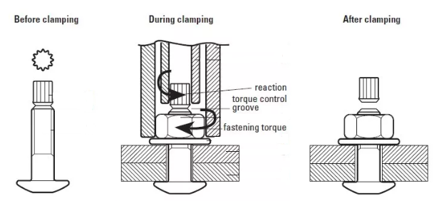 TC 볼트는 머리가 둥글어 공구로 잡을 수 없는 대신 볼트 끝부분에 핀테일(pintail)이 붙어 있다. 전용 공구로 핀테일과 너트를 동시에 잡고 너트를 조인다. 핀테일이 비틀림 응력에 의해 파단될 때까지 조이면 규정된 토크에 도달한 것이다. 혹은 달리 말하면 조이는 힘이 규정된 토크에 도달하면 핀테일이 부러진다. 이렇게 하면 동일 규격의 볼트는 모두 똑같은 힘으로 조일 수 있게 된다. 규정된 토크로 조였는지 토크렌치 들고 검사할 필요도 없고 제대로 조이지 않아 나사가 풀리는 사고도 방지된다.