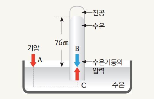 이 문제는 중학교 때 배운 토리첼리의 실험을 기억에서 떠올려 보면 간단하다. 이탈리아의 수학자이자 물리학자인 에반젤리스타 토리첼리(Evangelista Torricelli, 1608~1647)가 수은주를 이용해 기압을 측정한 것으로, 인류 역사상 가장 유명한 실험 중의 하나다.