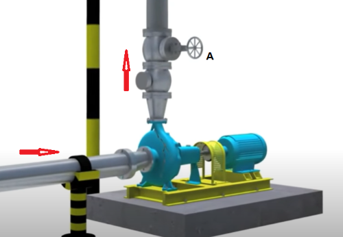 간단한 퀴즈와 함께 글을 시작해보자. 다음 그림과 같이 토출구(outlet or discharge)에 배관이 접속된 펌프가 있다. 농업용으로 옮겨다니는 펌프가 아닌 이상 대개는 이렇게 설치될 것이다. 여기서, 토출구 밸브 A를 닫고(꼭 잠그고) 펌프를 가동하면 어떻게 될까?