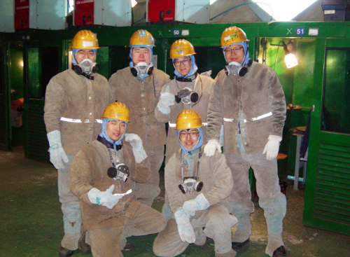 이 복장을 기온이 38도가 되고 작업장이 사우나가 되어도 하나도 생략할 수 없다.