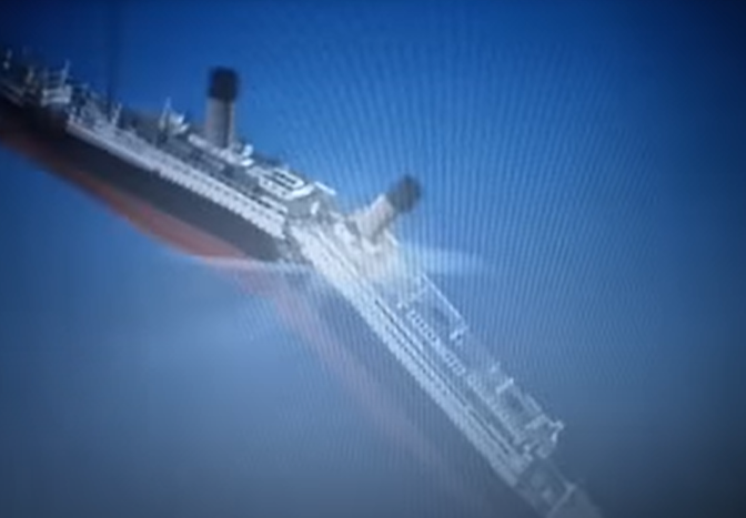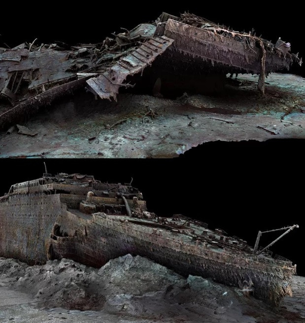 타이타닉호 선미(上)와 선수(下) 잔해. 실사(實寫)는 아니고 사진 자료를 3D로 모델링했다. 그 때까지는 배가 온전한 형태로 가라앉았다는 게 정설이었다. 일부 생존자들이 한치 앞도 보이지 않는 어둠에서도 용케 배가 두동강 나는 상황을 목격했고 그렇게 증언했으나 거의 모든 조사기관이 무시했다. 어떻게 그 덩치 큰 배가 도끼로 쪼갠 듯 반으로 갈릴 수 있을까?