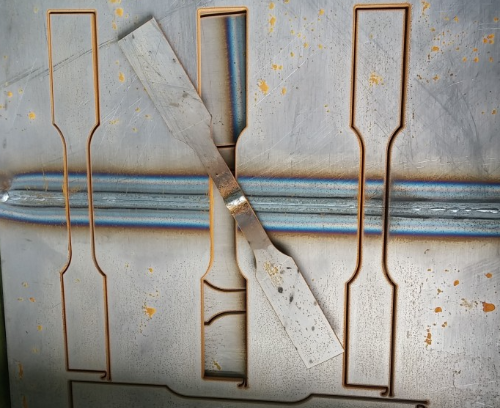 용접 시편에서 인장시험을 위한 시험편을 따내고 있다.
