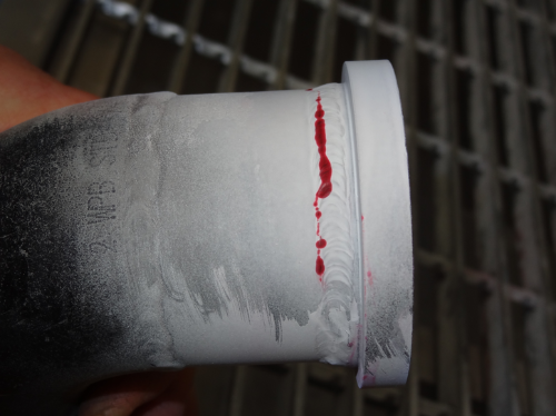 염료 침투 검사는 현장에서 다들 PT라고 한다. Dye Penetration Test의 약자다. 비파괴검사 중에서는 유일하게 용접사 스스로 할 수 있다. 용접부 표면에 생긴 작고 가는 균열(crack) 혹은 작은 구멍(pinhole)은 육안으로 보이지 않는데, 침투액을 뿌리고 좀 기다렸다가 닦아낸 후 현상액을 뿌리면 흰색 현상액 위로 균열이 선명하게 드러난다.