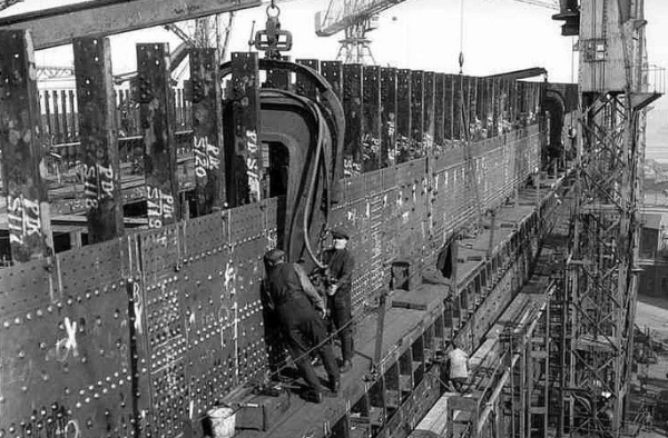 선박 건조 광경. 촘촘한 리벳 구멍를 보라.