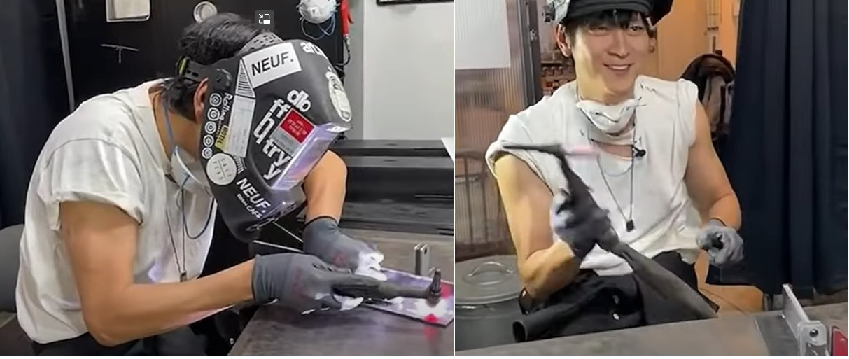 영화배우 강동원 씨의 불활성가스 텅스텐 아크용접(TIG). 상당한 숙련을 요하는 용접인데, 복장에 문제가 있다. 안전하다 해도 최소 토시 정도는 껴줘야 한다.