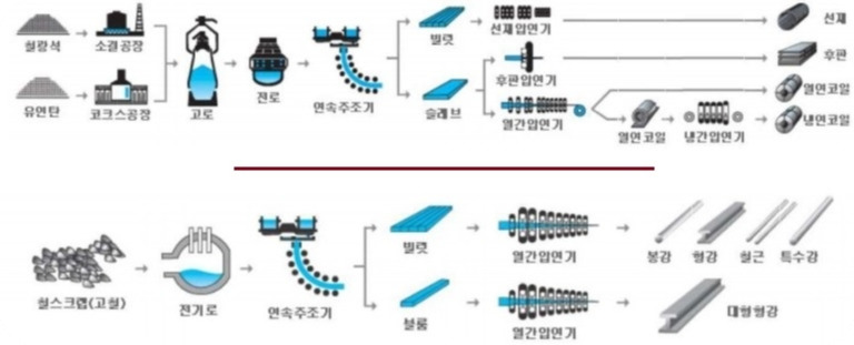 일관제철소(上)와 미니밀(下)의 공정 비교