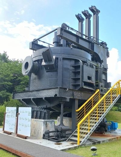 음성 철박물관 야외에 전시된 전기로 실물. 3상 교류전원을 사용하므로 전극봉이 3개다. 로를 기울여 쇳물을 출탕할 수 있도록 하부에 치차식 경동장치가 있다.