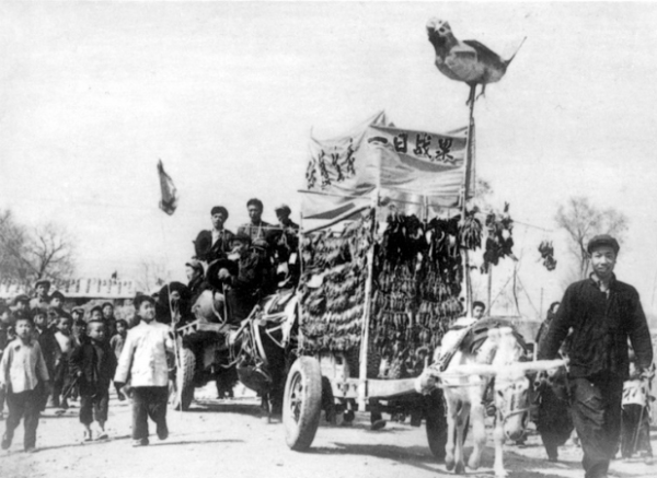잡은 참새를 수레에 싣고 퍼레이드를 벌이고 있다.