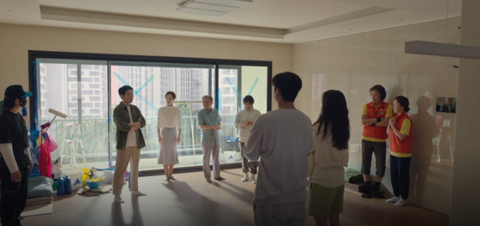 이 작품은 못내 아쉬운 두 가지가 있다. 무엇보다 아쉬운 것은 최근 <더 글로리>에서 놀라운 실력을 보여준 안길호 PD의 비주얼적인 강점이 특정된 공간으로 인해 잘 살아나지 못했다는 점이다. 고립된 공간을 배경으로 하기 때문에 시종일관 새 아파트의 배경만을 보여주는데, 이 공간들이 비주얼적으로 그리 탁월한 배경이 되어주지 못한다. 아파트 복도와 헬스장 그리고 옥상 정도가 배경의 전부라, 단조로운 배경 구성과 어색한 조명을 계속해서 보여주게 된다. 초반부 아파트에 고립되기 전 보여줬던 비주얼과 비교해 보면 배경에서 주는 아쉬움을 금방 인식할 수 있다.