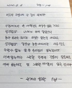 여행 가방 꾸리기와 물건을 버리는 습관에서 시작해서 놓음과 닿음으로 이어지는 작가님의 관계에 대한 이야기. 사람에게 온 어떤 것, 특히나 사연이 있는 것을 쉽사리 버리지 못하듯 사람들과의 관계 역시 그러하다. 작가님은 관계를 '어디에선가 누구는 놓고 어디에선가 누구는 닿는다'라고 표현하신다. 앞으로도 살아가면서 관계는 멈추지 않고 쉼 없이 흘러갈 거다. 때로는 살아있음으로 그리워하기도 하고 살아가야 하므로 잊히기도 할 거다. 그래도 최소한의 놓음, 최대한의 닿음으로 따뜻하고 안온함을 느끼며 살기를 소망한다.