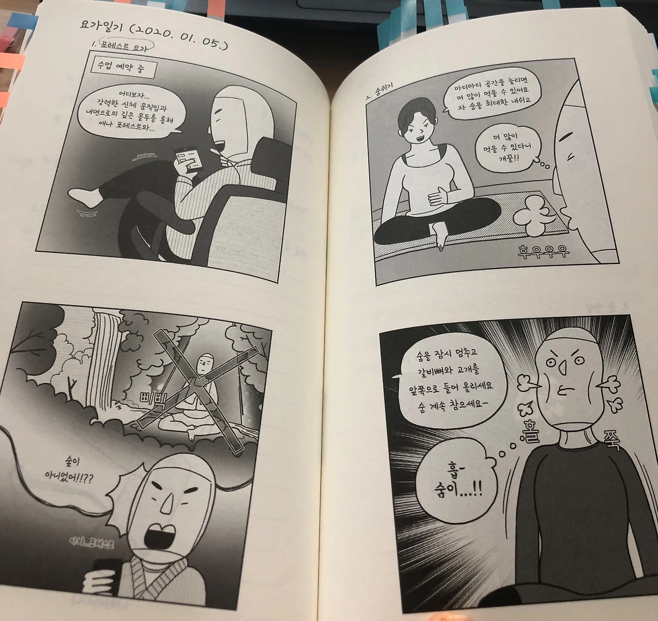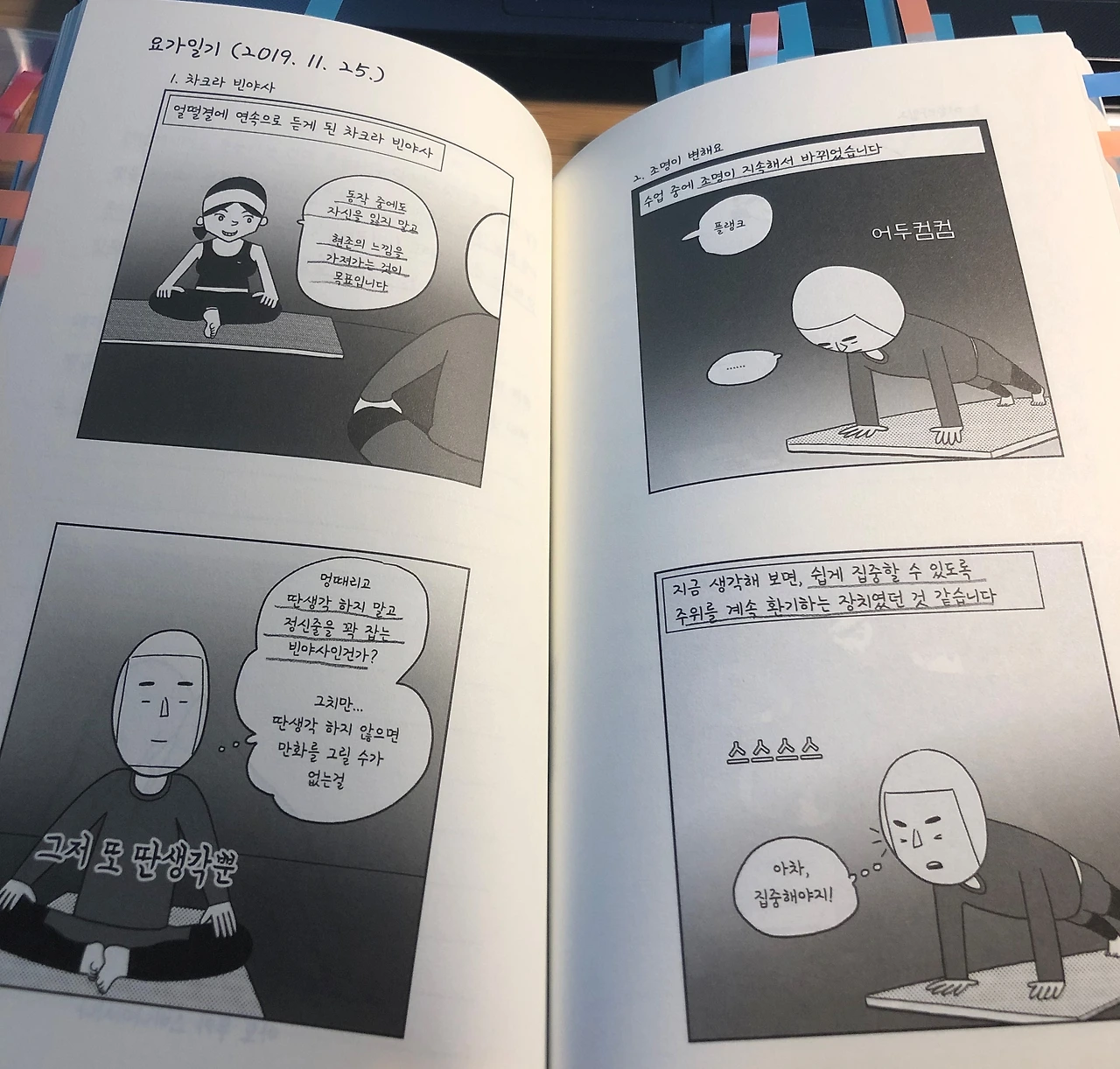 아바매글 리더 글밥님이 책 소개를 해 주셨고 읽고 리뷰를 쓰면 되니 필요하면 신청하라고 하셨다. 요가 만화라는 것이 궁금하기도 하고 무엇보다 부담 없이 재밌게 읽을 수 있을 거 같아 망설임 없이 바로 문자를 날렸다. 하루 만에 배송을 받고 오늘 새벽에 드디어 완독! 간단히 인상 깊었던 내용을 소개해본다.