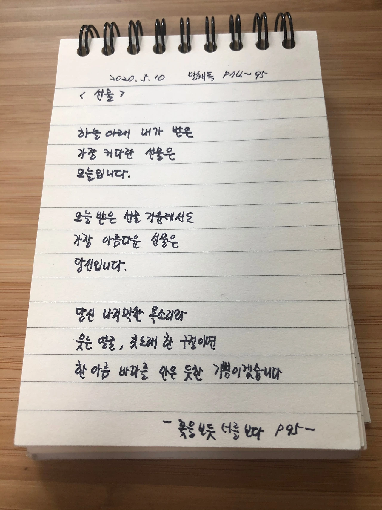 지난번 첫 번째 라이브 토크에는 참석하지 못해 아쉬웠다. 카페 봉사하는 날이라 새벽에 인증하고 여유 있게 참석하려 했으나 몸이 안 따랐다. 퇴근 후 부랴부랴 서평을 쓰다 보니 이미 종료되어 톡 방의 댓글을 읽는 걸로 만족했다. 남은 기간 내 몫을 다한 뒤 잠시 짬을 내어 그전에 인증한 글만이라도 보려고 한다. 부족한 글을 공감해 주고 정성스러운 댓글을 남겨주시는 리더님과 멤버분들 덕분에 하루 하루해 나가는 힘을 얻는다. 오늘은 필사하고 있는 나태주 시인의 시집 중에서 선물이라는 시가 눈에 들어왔다. 함께 하는 동료들이야말로 내가 받은 가장 아름다운 선물이란 생각을 했다. 그런 고마움으로 한 자 한 자 적어내려 갔다. 멤버들을 알아가고 읽는 즐거움도 놓치지 않길 그리고 모두 함께 끝까지 완주할 수 있길 바란다. 한 달 파이팅!