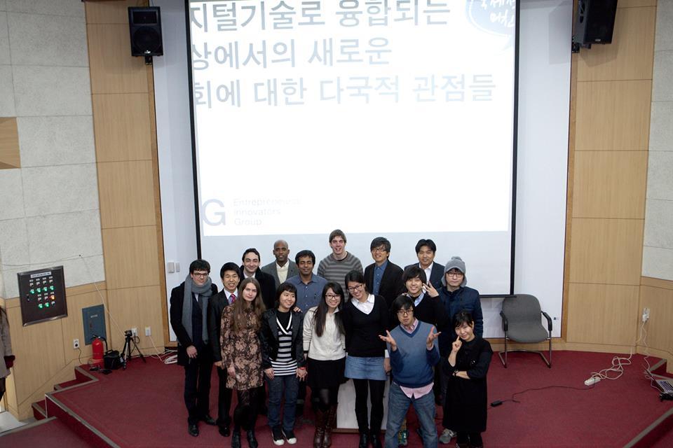 현재 20여개 국 250여명의 멤버로 구성된 EIG는 2010년 12월 영하 20도에 이르는 추운 겨울밤, 홍대 앞에서 모여서 밤새워 열정을 태우곤 했던 한 dozen의 다국적 젊은이들로 시작되었습니다.