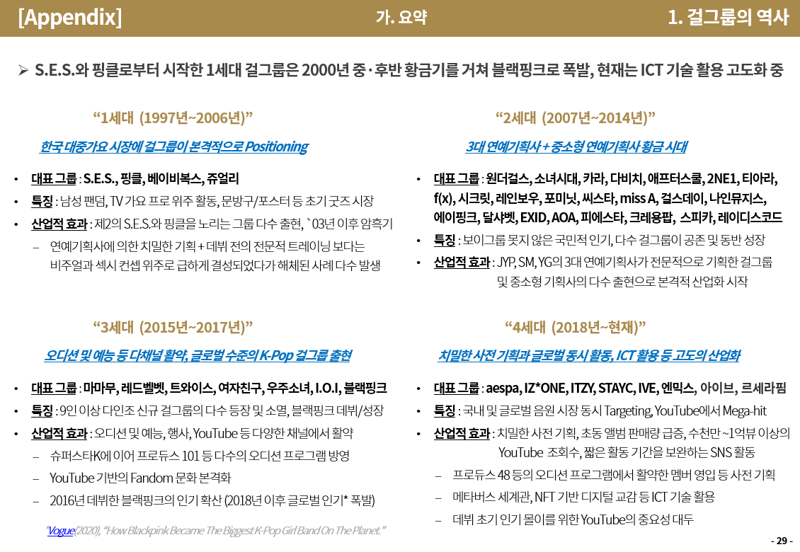 (1년이 넘었으니, 공소시효(?)는 지났다고 보고) 이제서야 밝히지만, 지난해 이직 과정에서 심장이 뛰었던 회사가 하나 있었다. 대표님과 1시간 반 동안 1:1 면접 끝에 후속 과제를 받았다. 걸그룹은 #소녀시대 에서 멈춰있던 내가 1, 2, 3, 4세대 걸그룹을 공부하고, (예전에 공부했던) 전략 교과서의 최신판을 사서 밑줄 그어가며 핵심을 상기하고, 주요 내용과 방향을 간추려 보고서를 가다듬고 가다듬어, 40페이지로 된 과제를 제출했다. (결론적으로, 내 능력 부족에 더해 김가람 학폭 이슈로 채용은 중단됐다.)