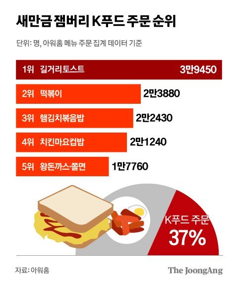 2023년 08월 01일(화)부터 2023년 08월 12일(토)까지 2주가량 열리는, 제25회 세계스카우트잼버리의 급식과 매점, 식음료 서비스 부문 공식 후원사인 아워홈에 따르면, 청소년 43,000명 중의 37%는 K-Food 밀 박스(Meal Box)를 사전 주문했다. 가장 인기가 많은 것은 길거리 토스트이고, 뒤를 이어 떡볶이, 햄김치볶음밥, 치킨마요컵밥 등이 인기가 많다. (분식을 좋아하는 청소년의 입맛은 전 세계적인 것 같다.)