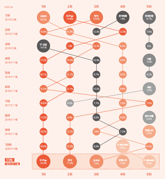 한류라고 하면 K-Pop이나 「오징어게임」으로 대표되는 K-Content를 떠올리지만, 놀라운 것은 한류의 2번 타자, 5세대 한류가 한식(K-Food)이라는 점이다. 특히 지난 10년간 한국과 관련하여 떠오르는 이미지에서 가장 큰 변화는 바로 한식이다.