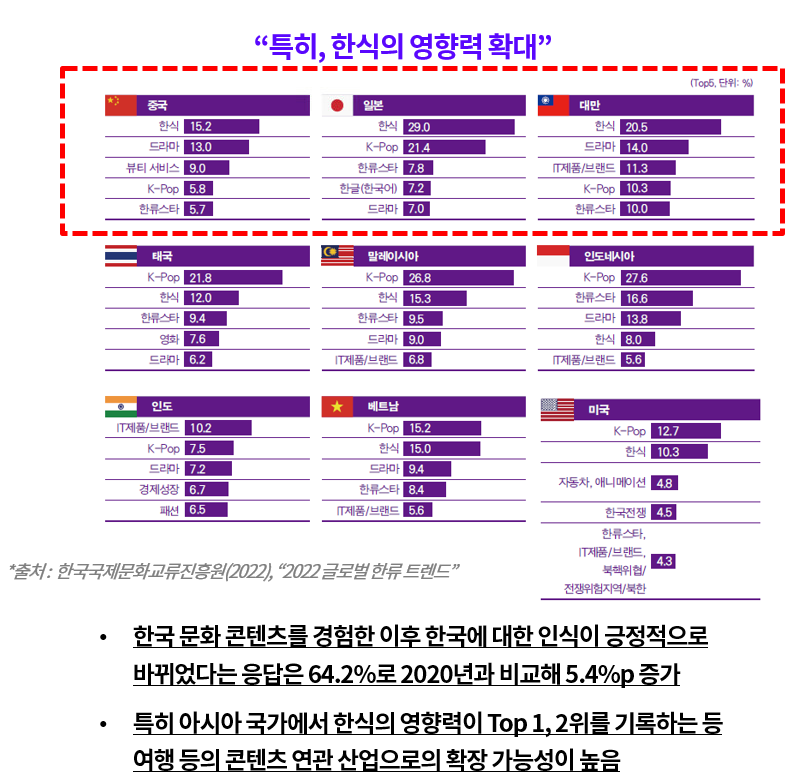 한식에 대한 선호는 미주나 유럽 대비, 중국/일본/대만 등 동아시아권에서 높게 나타난다.