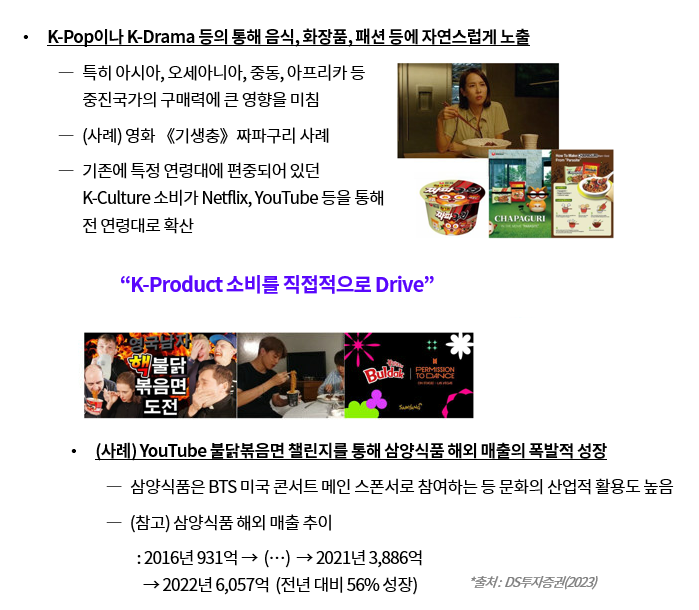 K-Culture 소비 확대가 K-Product, 특히 그중에서도 한식 소비를 직접적으로 Drive 한다는 내용은 큰 시사점을 준다. 그동안 생각해 왔던 한식의 글로벌화 관점도 오프라인과 온라인 모두에서 다시 한번 생각해 볼 필요가 있다.