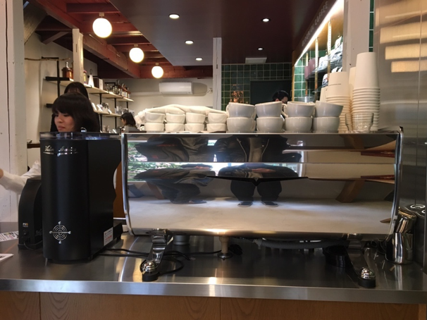 안으로 들어서면 이렇게 에스프레소 바가 보인다. 2018년 WBC World Barista Championship 의 공식 머신인 빅토리아 아르두이노 Victoria Arduino 사의, 블랙이글 Black Eagle 을 사용하고 있다. 에스프레소 바를 맡고 있는 여성 바리스타의 얼굴이 살짝 보인다. 어쩐지 어디선가 많이 본 얼굴이었다. “에이, 설마 미키 스즈키가 여기서 일하고 있겠어?” 하는 생각으로 지나치려다 혹시나 해서 물어보았다. "혹시 그쪽이 미키 스즈키 씨가 맞나요?" 환한 미소로 그렇다고 답해주었다. 바로 내가 이 카페를 방문하기 몇 주 전에 한국 코엑스에서 열렸던 2018 WBC에서 2위를 했던 바로 그 미키 스즈키 Miki Suzuki 였다.