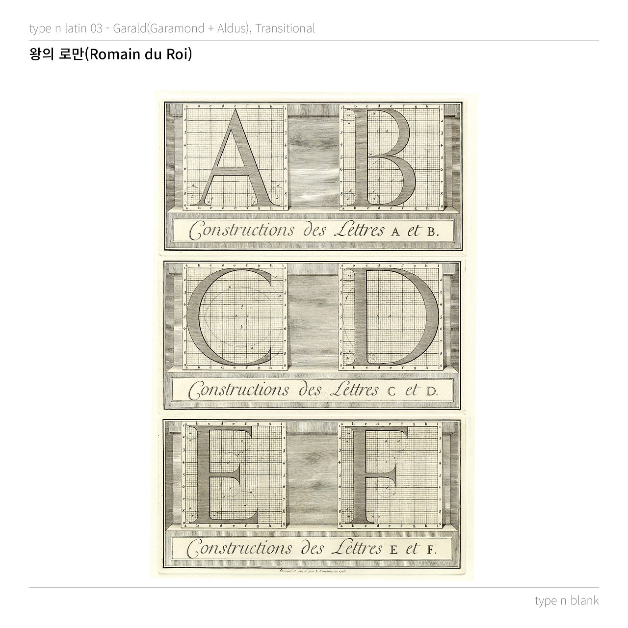 17세기, 루이 14세는 프랑스 과학 아카데미(French Academy of Sciences)에 왕실 인쇄소에서 사용할 새로운 서체 디자인을 의뢰했습니다. 로맹 뒤 로이(Romain du Roi), '왕의 로만'으로 불리는 이 글꼴은 2,304개의 모듈로 이루어진 그리드 위에 형태적 정교함과 수학적 아름다움을 지향하여 설계되었으며, 이 글꼴의 개발을 위해 수학자와 과학자, 기술자들이 참여했습니다. 1692년에 의뢰된 86자의 이 글꼴은 1702년에 처음 사용되었고, 1745년까지 제작되었습니다.