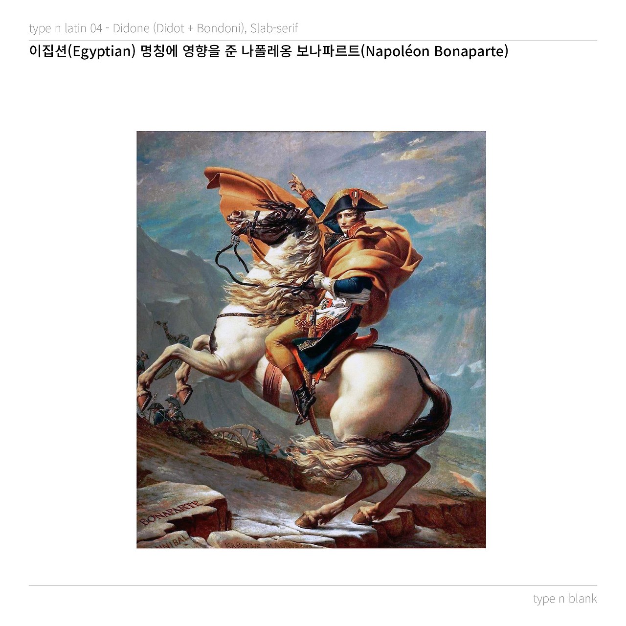 슬랩 세리프 관련하여 재미있는 점은 프랑스의 지도자 나폴레옹이 이 계열 중 이집션(Egyptian)이라는 명칭과 연관되어 있다는 점입니다. 나폴레옹은 1798년부터 1801년까지 영국을 견제하기 위해 이집트와 시리아의 오스만 영토에167명의 학자와 과학자들을 보내어 과학 사업 등을 진행했습니다. 이 계획은 프랑스 군대의 철수로 끝났지만, 참여했던 학자와 과학자들은 이집트 문화에 대해 연구했고 많은 지식들을 유럽으로 가져오게 되었습니다. 그 결과 유럽 및 서구에서는 이집트 문화의 매력에 빠지게 되었고, 유행하기 시작했습니다.