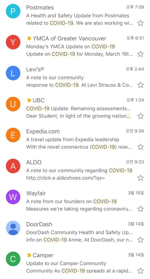 전 세계가 신종 코로나바이러스 감염증(코로나19) 때문에 비상이 걸렸다. 한국은 하강세로 접어든 반면 미국에서는 급속도로 확산하고 있는 요즘 내 이메일함엔 각종 기업으로부터 온 코로나19 관련 메시지가 차곡차곡 쌓이고 있다.