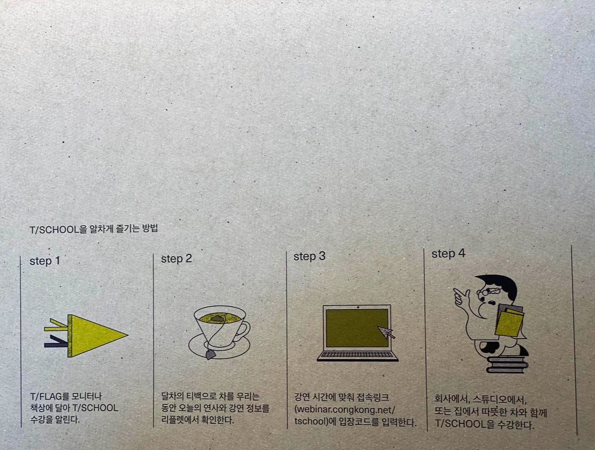 포스터는 아니었고 카드 보드지로 만들어진 설명지, 수업 시간표와 강연자들의 간략한 정보가 들어있는 브로셔, 스티커, 부직포 깃발, 그리고 수업 때 함께 마실 수 있는 티 팩들이 들어있었다. 그리고 역시 두성종이답게 모든 구성품들이 각기 다른 질 좋은 종이로 제작되었는데 종이들이 다 너무 좋았다.. 특히 스티커 용지가 천 느낌의 두툼한 야광 종이였는데 너무 마음에 들었다. 좀 변태 같긴 한데 혹시 나만 아직도 종이 냄새 맡나..? 책을 자주 읽지는 않지만 책이나 잡지 보면 냄새 맡는 게 습관이 되어버린 거 같다. 종이 냄새 너무 좋다. 흠흠.