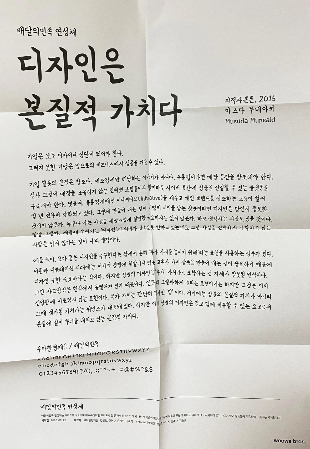 그리고 SNS를 통해 나름 잘 알려진 이 글이 담긴 정말 큰 종이 포스터가 (2절지는 되는 거 같다) 2개나 함께 왔다. "디자인은 본질적 가치다"라는 제목부터 내용까지 정말 흠잡을 때 없는, 제발 많은 기업들이 봤으면 하는 그런 글이다. 물론 회사나 업종마다 차이가 있겠지만 인턴 경험과 이전 회사에서 짧은 경험, 그리고 현업자들의 이야기를 들어보면 디자인을 사업의 핵심 과정 혹은 업무라고 생각하기보다 부가 가치라고 생각하는 사람이나 회사가 아직도 너무 많은 것 같다. 이 글에 나와있는 것처럼 제품이나 서비스에 부여되는 '디자인'의 의미가 급속도로 변화하고 있음에도 불구하고 (심지어 이 글은 2015년에 작성되었다) 그런 사실을 진지하게 자각하고 있는 사람들이 아직 주류는 아닌 것 같다. 빠르게 변하고 있는 현재 사회와 시장 속에서 디자인이 "결코 덤에 비유할 수 없는 요소로서 본질에 깊이 뿌리를 내리고 있는 본질적 가치"라는 것을 더욱 많은 사람들이 인지하고 그에 따라 행동했으면 좋겠다.