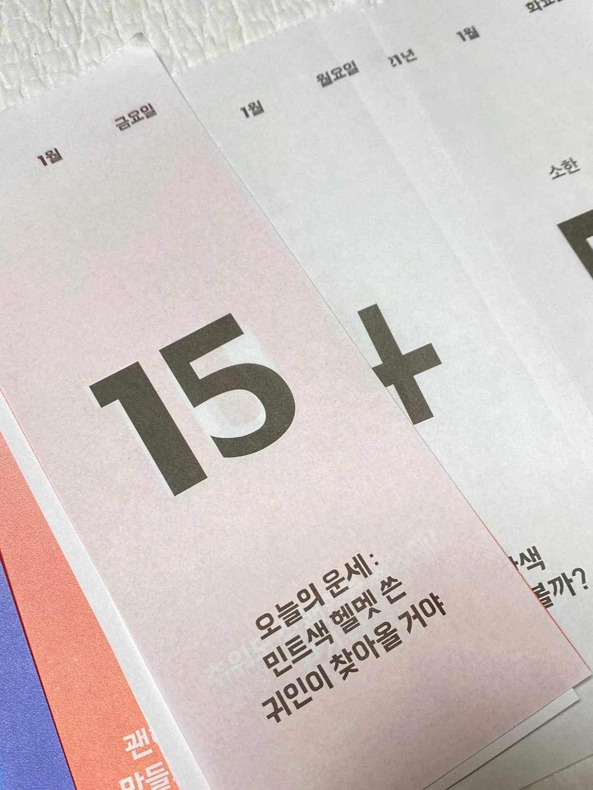이미 벌써 2월이니 1월 양의 종이를 다 뜯어내야 했는데 그게 얼마나 재밌던지! '챠라락' 소리는 내며 꽤나 힘을 줘서 뜯어내야 하는 종이의 소리와 느낌이 정말 오랜만에 느껴보는 찢어지는 종이의 감촉(?)이라 중독성 있는 희열감이 느껴졌다. 1월 종이가 끝나갈쯔음엔 약간 아쉬울 정도였다. 그리고 하루하루 다르게 쓰여있는 문구를 보는 것도 흥미로웠다. 어떤 날엔 정말 열심히 하루를 살아야 할 것만 같은 자기 계발적인 문구, 어떤 날엔 감성이 폭발하는 문구 (이번 주도 수고 많았어!) , 어떤 날엔 뜬금없는 질문 (김치찌개 최애 토핑은?), 또 어떤 날엔 그냥.. 랜덤한 글 (얼죽아인 사람 손!) 등 매일 다른 글이 쓰여있었는데 이게 은근 위로가 되고 다음 날 문구를 궁금하게 만드는 그런 매력이 있었다. 주말에만 바탕 색상이 있는 것도 너무 좋다. 주말, 짧고 소중해.