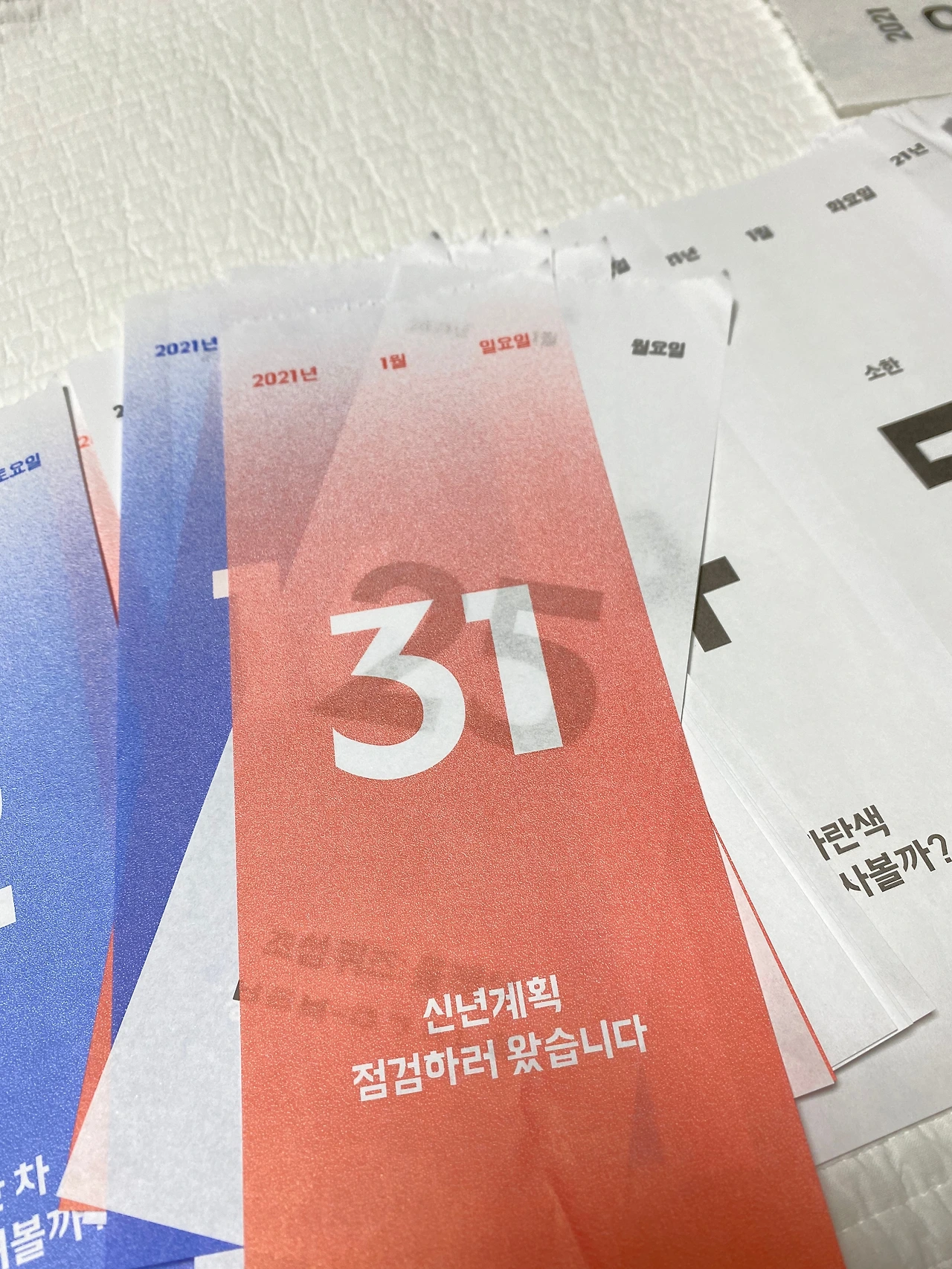 신나게 1월 종이들을 뜯다가 나를 순간 멈칫하게 만든 1월 31일의 이 문구. 아 나 신년 계획 세웠었지.. 근데 뭐였더라? 성실하게 플랜을 따르지는 않지만 계획하는 것을 정말 좋아하는 나는 2020년 말에 새로운 다이어리를 장만하고 표지도 스티커로 예쁘게 꾸몄더란다. 그렇지만, 역시나, 예상대로, 생각보다 바쁘게 지나간 1월 탓을 하며 텅텅 빈 페이지들.. 내 신년 계획 1번인 꾸준히 다이어리 쓰기는 일단 실패다. 그렇지만 그것을 제외하고 주식 시작하기, 브런치 작가 신청하기, 영자 신문 읽기 등 아직 한 달 밖에 안 지난 거 치고는 꽤 많이 계획을 실천한 것 같다. 1월을 야무지게 보낸 것 같아 뿌듯하군. 그래도 먼슬리 말고 데일리 목표는 많이 아쉬웠다. 내가 요즘 쓰고 있는 Tibah라는 하루 습관 기록 어플을 확인해보니 내가 세워놓은 매일 목표 (새벽 2시 전에 자기, 충분한 수분 섭취, 책 한 챕터 읽기, 스쿼트 2 세트 등)는 못 지킨 날이 지킨 날보다 많았다. (다시 보니 매일 고정으로 설정해놓은 목표가 좀 많긴 한 것 같다..쩝) 어떻게 보면 운명적으로 "오늘에 집중" 일력이 나에게 오게 되었으니, 오늘부터 이걸 쓰면서 다른 달보다 짧지만 그렇기 때문에 더욱 소중한 2월은 하루하루의 목표를 이루는 것에 집중하면서 보내고 싶다. 매일 아침 전 날 종이를 뜯으면서 뿌듯한 마음이 들 수 있었으면 좋겠다!