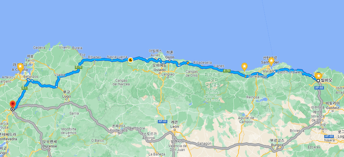 원래는 여러 도시에 하루씩 머물 생각이었는데, 3개 거점도시를 중심으로 여행하는 것으로 계획을 바꿨다. 대신 첫 여행지인 빌바오에서 두 번째 여행지인 산티아고 데 콤포스텔라 이동할 때 렌트카를 빌렸다. 고속도로로 약 600km 거리인데, 가는 길이 해안에 근접해서 중간 중간 가고 싶었던, 둘러보고 싶었던 도시에서 커피 한 잔, 요기거리 잠깐씩 해결하면서 다른 여행지에 대한 욕구를 해소하려고 한다.