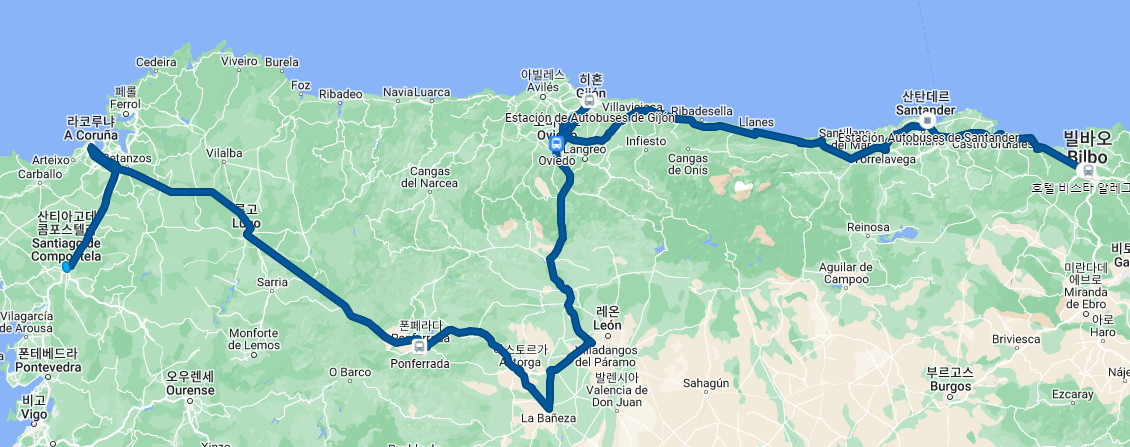 국제운전면허증을 두고 와버리는 바람에 예약했던 렌트카는 취소 되고, 빌바오에서 산티아고까지 갈 길이 막막해졌다. 빌바오에서 산티아고까지는 약 600km 정도 되는데 바로 가는 이동수간이 항공 밖에 없었다. 다만 비용이 100만원 가까이였고, 우리 여정에 맞는 시간도 없었다. 그래서 헐레벌떡 지상으로 이동할 수 있는 수단을 막 찾아봤다. 가장 좋은 건 blablarcar(카풀 서비스)였는데, 스페인 현지 번호가 없으면 계정 인증이 안 되어서 결제를 할 수 없었다. omio로도 찾아보니 바로 가는 버스나 기차는 없었고, 빌바오에서 히혼을 갔다가, 히혼에서 폰페라다를 가서 환승해서 산티아고에 도착하는 버스가 있었는데.. 편도시간만 15시간이었다. 인천에서 뮌헨까지 13시간이었는데, 육상으로 이동하는 시간이 항공으로 이동하는 시간보다 더 많았다.