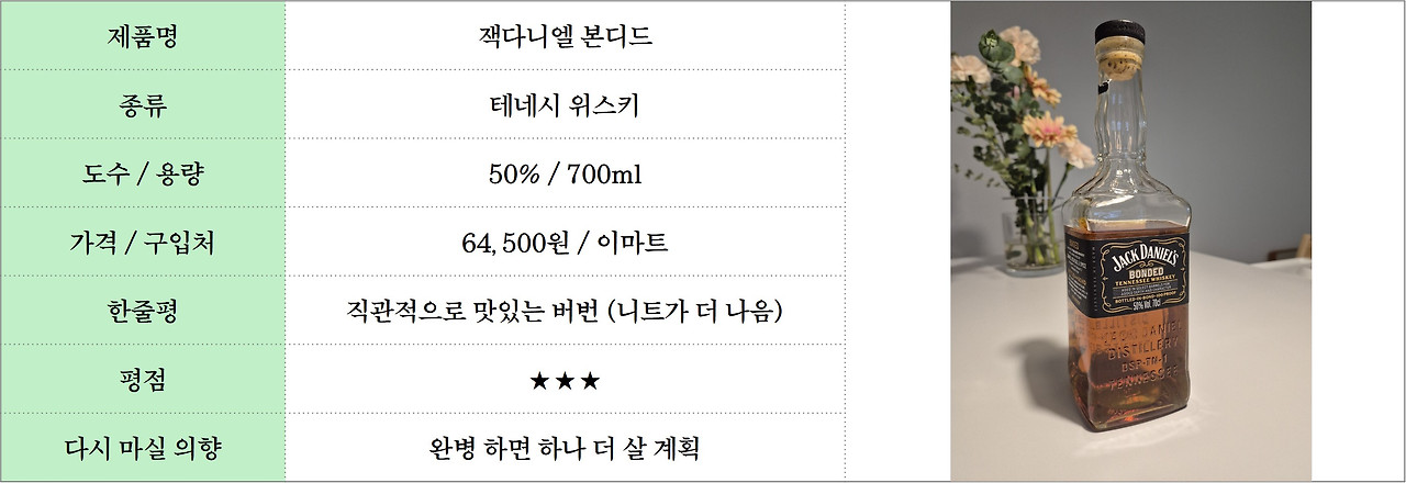 본디드는 최근 출시된 것으로 알고 있다. 위스키들의 출시년도를 모두 외우는 열정은 없다. 그러나 최신 제품이라는 것 쯤은 알고 있고, 그래서 구매하게 됐다. 사자 마자 마시는 버릇 탓에 집에 가져오자마자 마셨다. 직관적으로 맛있는 버번이었다. 잭다니엘스는 No.7으로 유명하지만 제일 사랑 받는 잭다니엘스는 No.7이 아닐 것이다.