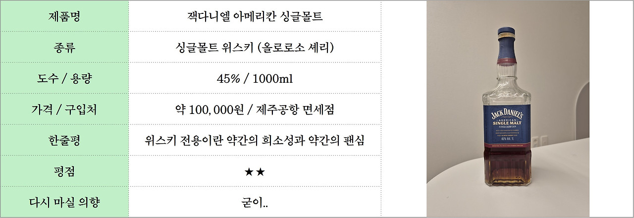 복잡한 향보다, 단순히 ‘맛있다’는 직관적인 감각이 더 중요하다. 그런 점에서 이 위스키는 내 기준에 딱히 와닿지 않았다. 다만, 일반적인 입문용 싱글몰트보다 도수가 높은 45도라는 점은 장점이다. 단지 내 입맛에 맞지 않았을 뿐이지, 퀄리티가 낮다거나 마실 가치가 없다는 말은 아니다. 그리고 잭다니엘스를 좋아하는 팬의 입장에서, 싱글몰트라는 실험적인 시도를 해준 것만으로도 충분히 응원하고 싶다.